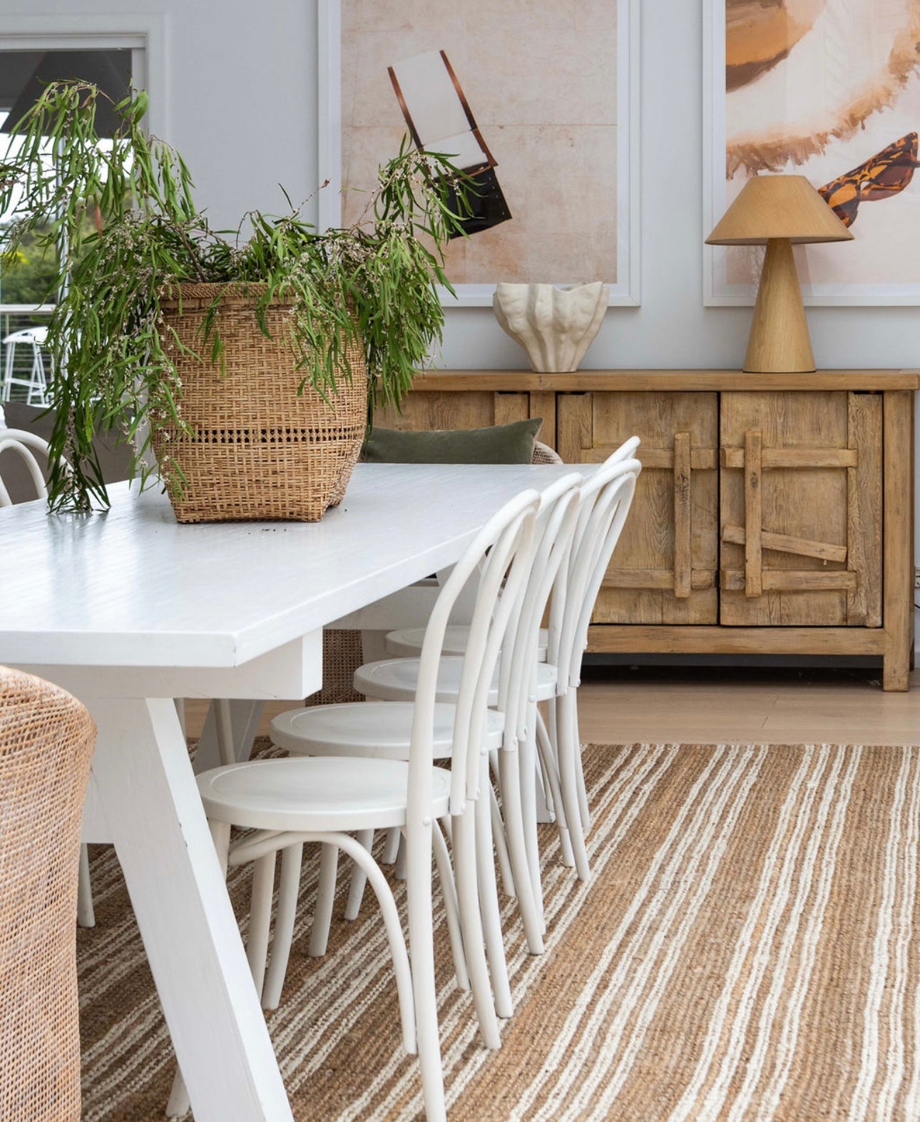 Mel incorporates natural materials like leather, wool, linen, and timber alongside carefully chosen statement pieces like cowhides or sheepskin throws. Fresh eucalyptus and dried botanicals add organic elements that connect indoor spaces with the beautiful natural environment outside.